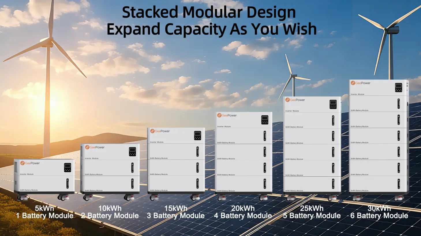 Modular design allows capacity expansion from 5 kWh to 30 kWh as your energy needs grow. Works with or without solar panels.