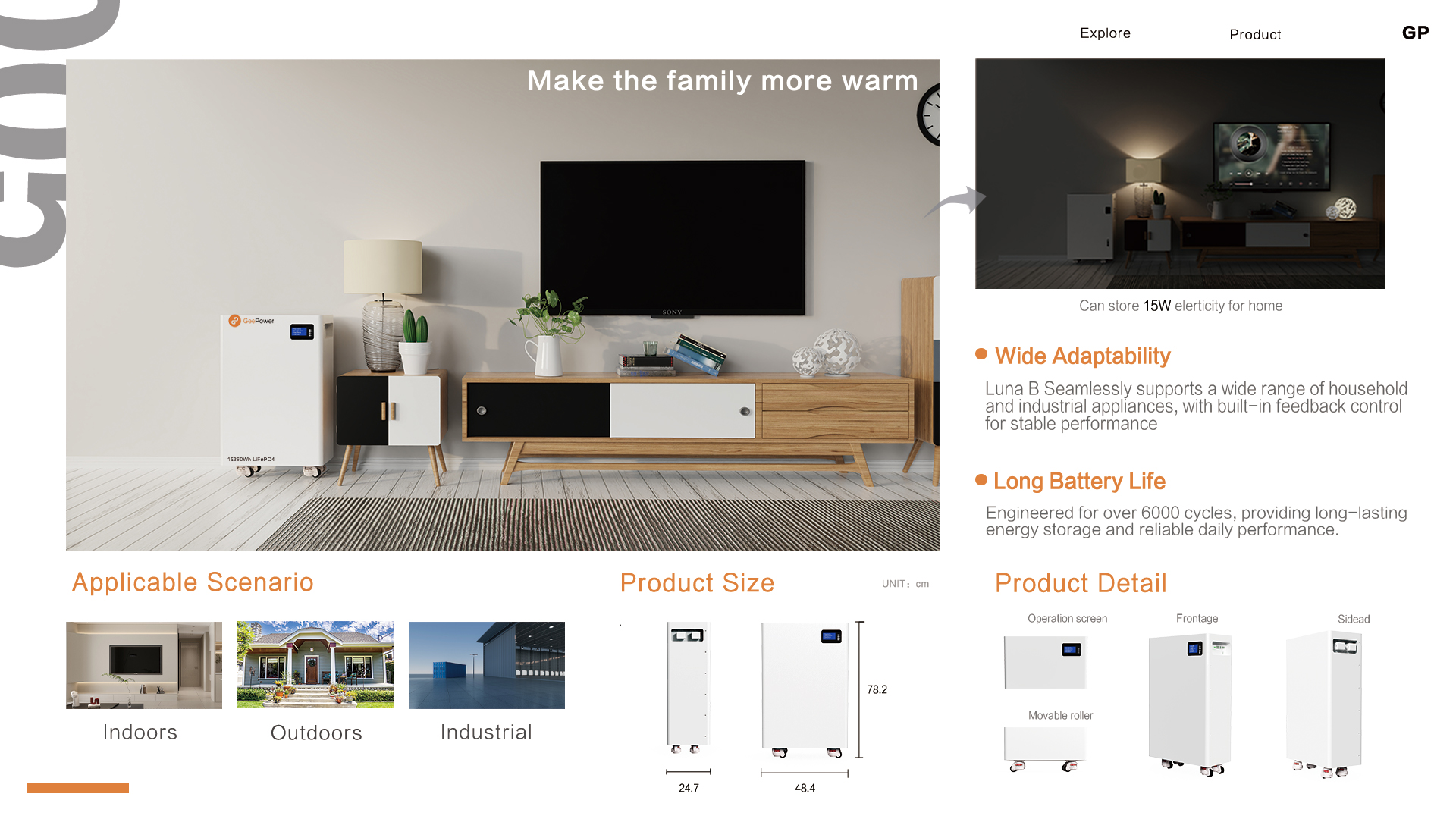 GeePower's Home Energy Storage Series provides stable,efficientan,and long-lasting power for residential use. Built with advanced LiFePO4 battery technology,our systems ensure safety,high performance, and extended lifespan.